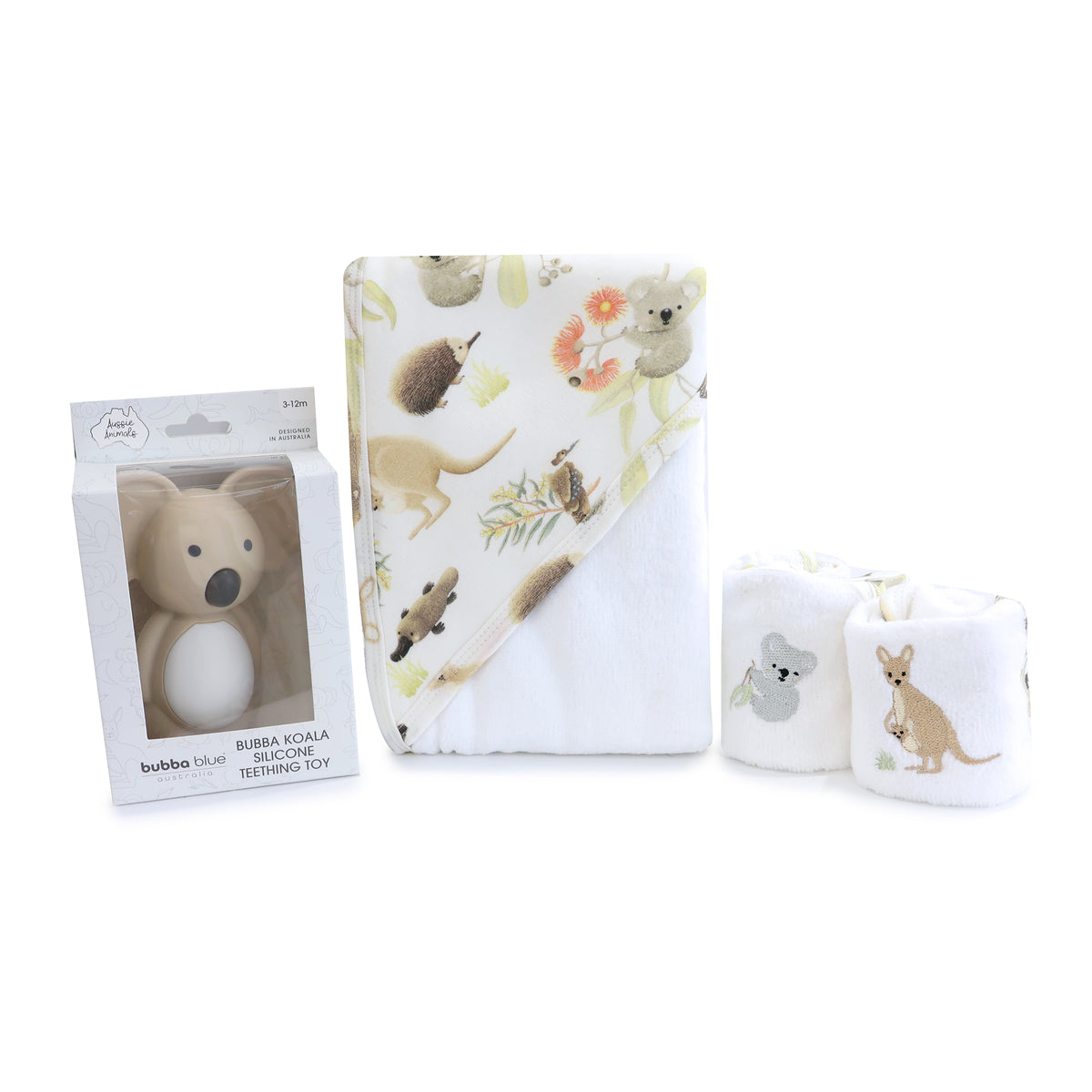 We’ve made gifting easy with our Aussie Animals gift set that little ones will love, featuring a gorgeous illustrated hooded towel, 2 x wash cloths featuring Australian animal characters and our super cute Bubba Koala teething toy.