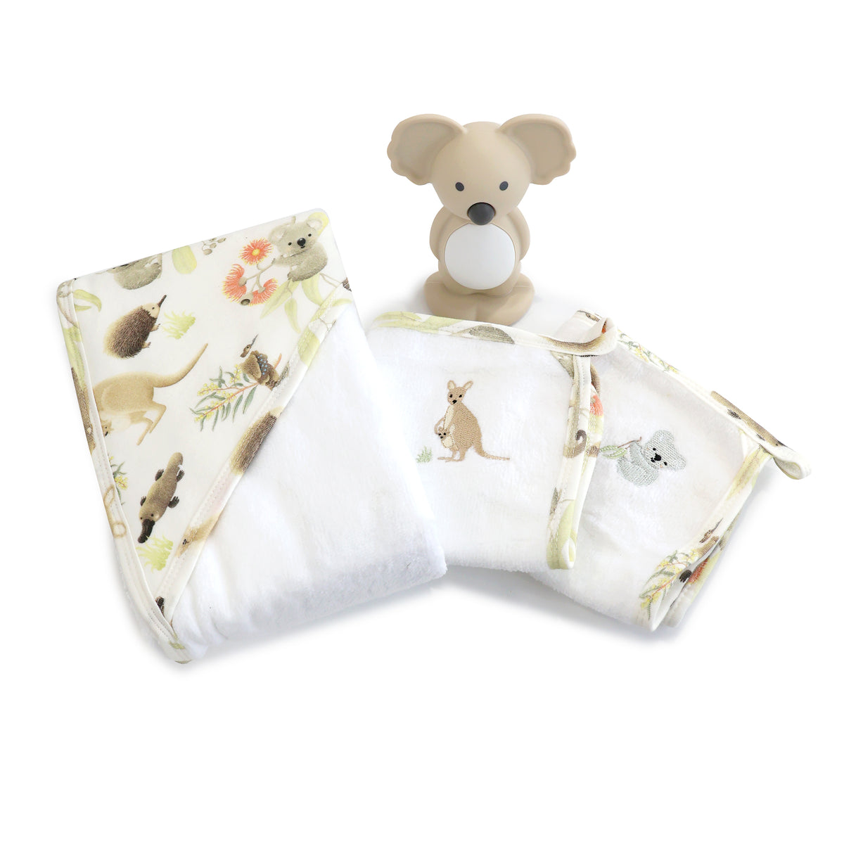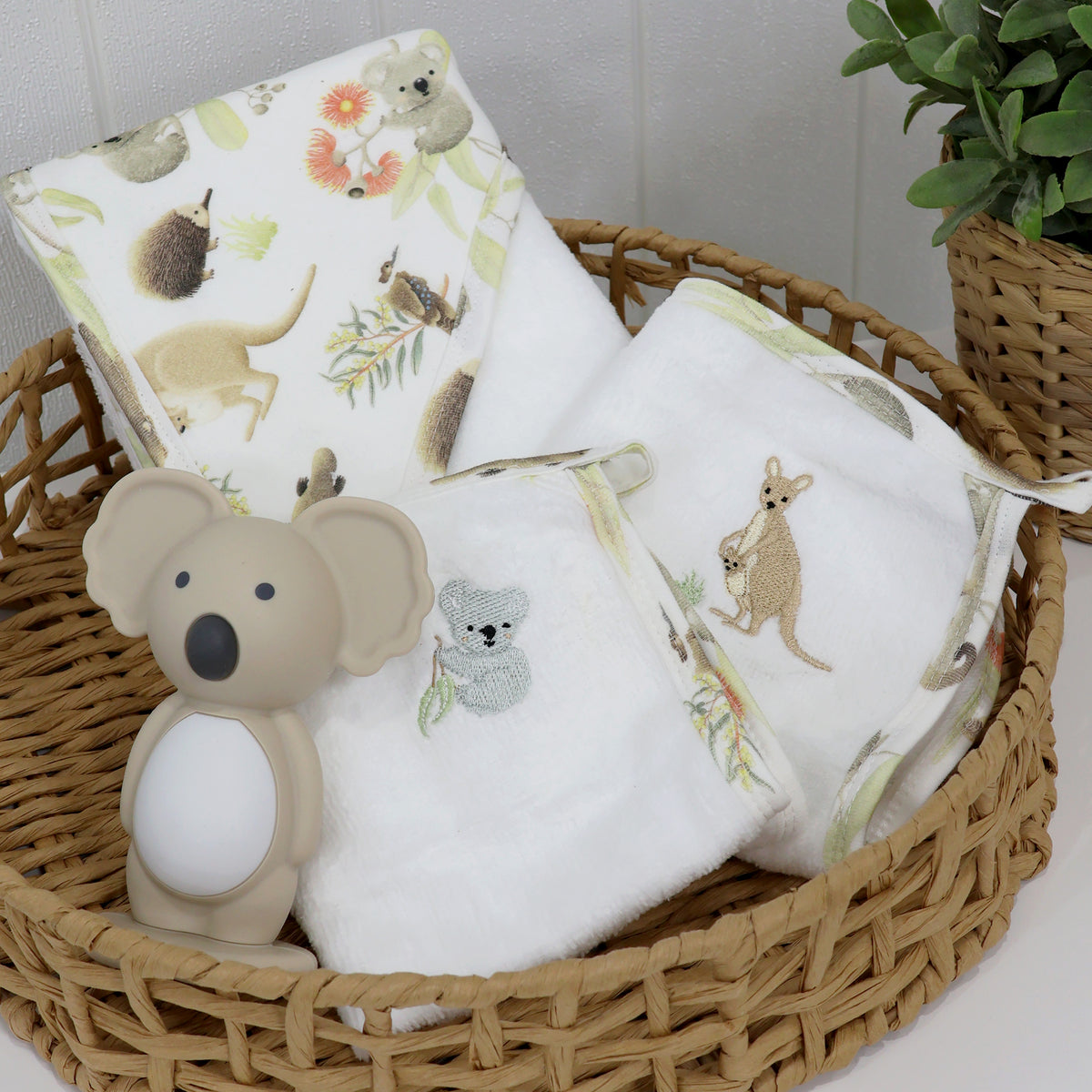4 PIECE AUSSIE ANIMAL GIFT SET: 1 x hooded towel, 2 x wash cloths, 1 x koala teething toy.
