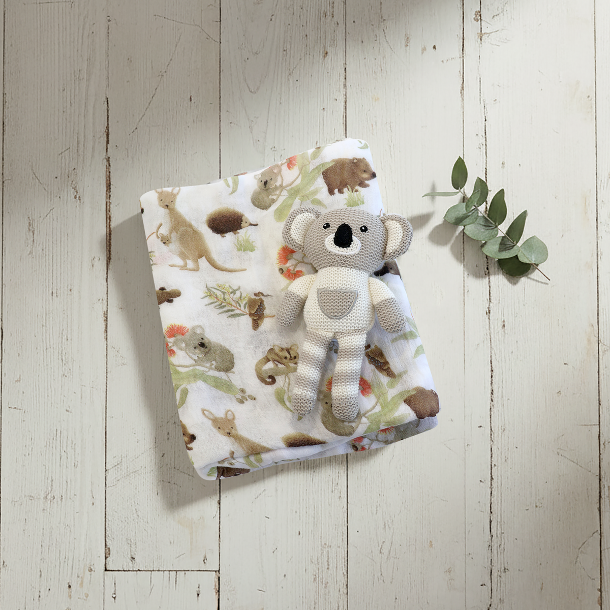 Aussie Animals Koala Muslin Swaddle Wrap and Knit Rattle Toy Gift Set