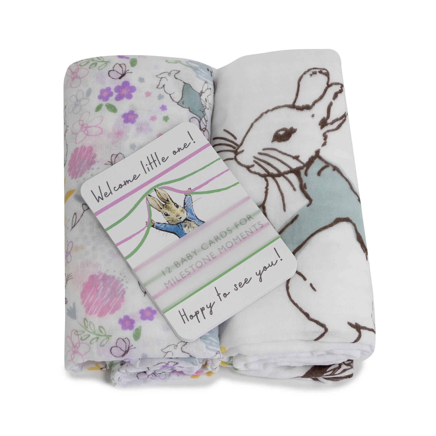 From the classic Beatrix Potter books comes this sweet and adorable collection. Peter Rabbit has a heart-warming effect on anyone who lays eyes on this lovable character. The adventures of Peter Rabbit and his friends, inspired by Beatrix Potters love of nature, continue to delight generations of children around the world. Good night to all little bunnies everywhere! Each set includes 2 large, super soft muslin swaddles and 12 adorable cards to capture and celebrate the exciting development milestones in your babys 1st year. So many possibilities for you and your baby to enjoy.