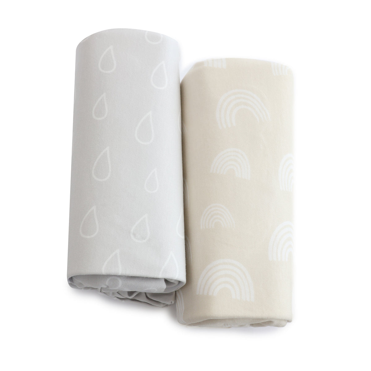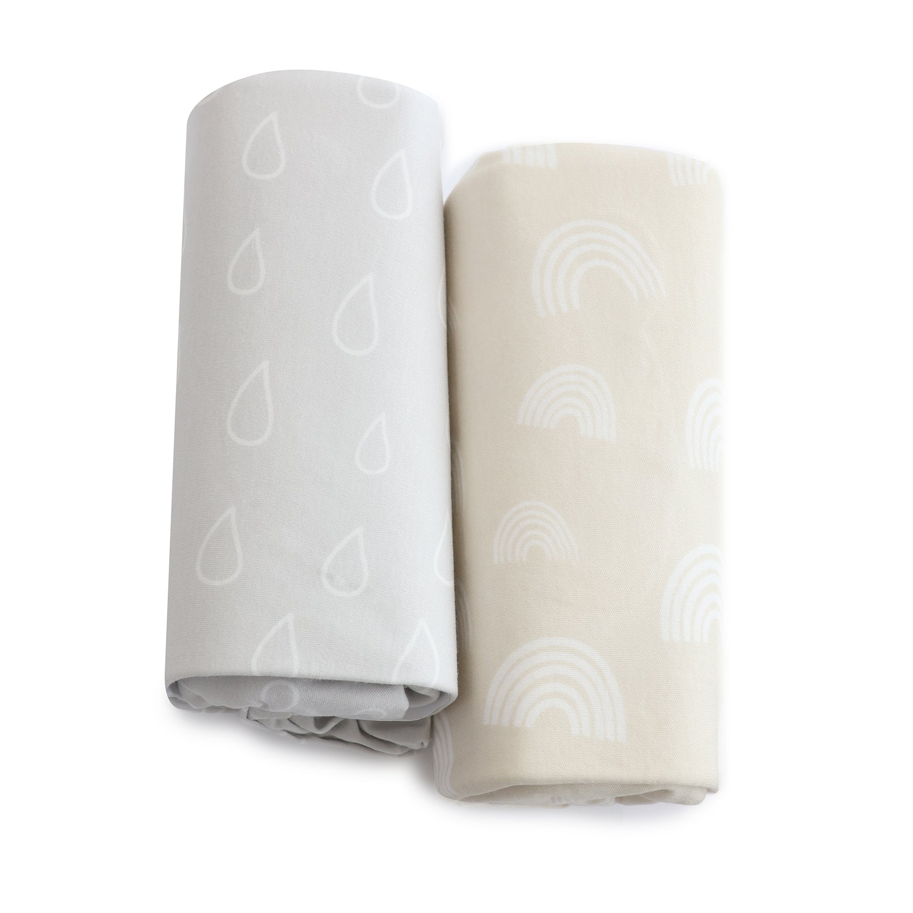Pack includes one grey raindrop design and one sand rainbow design cot fitted sheet.