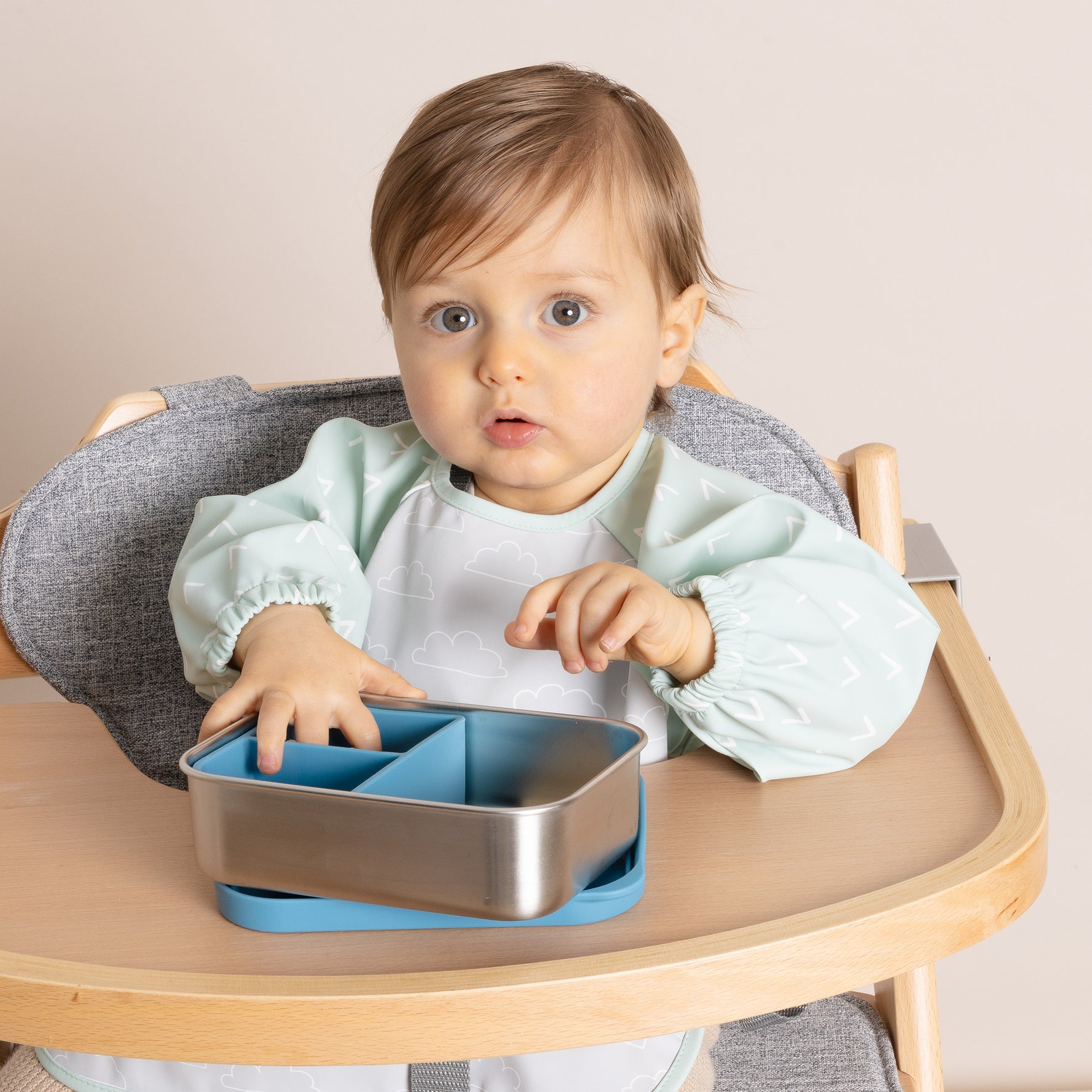 Our stylish feeding smocks are an absolute essential at feeding time to protect baby from mealtime messes. Made from a soft, lightweight and comfortable waterproof polyester with a smooth suede-like underside. This long sleeve smock with elasticised cuffs will help protect clothing underneath. The velcro neckline adjusts easily to suit 6m-2 years. The front pocket will catch any missed foods.  This stylish feeding smock is perfect for mealtimes, baby led weaning, messy play and arts & crafts.
