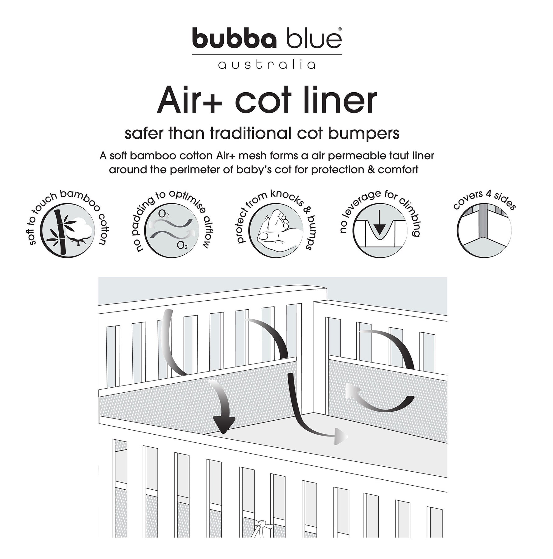 The Bubba Blue Air+ Cot Liner is the first and the best of its kind. Its slimline design uses an air permeable 3D spacer mesh & a bamboo cotton mesh to form a taut protective liner around the inside perimeter of the cot.