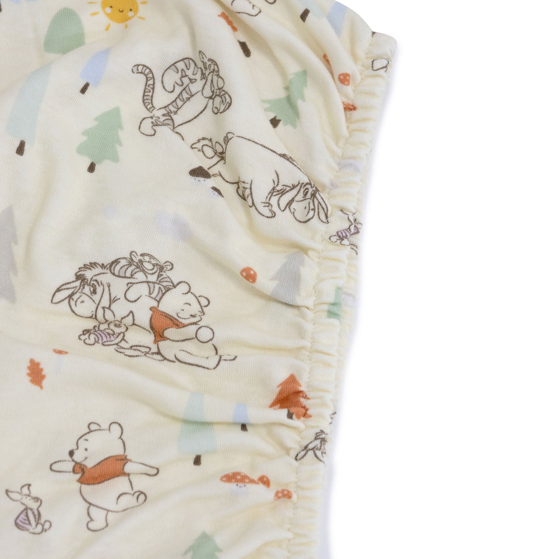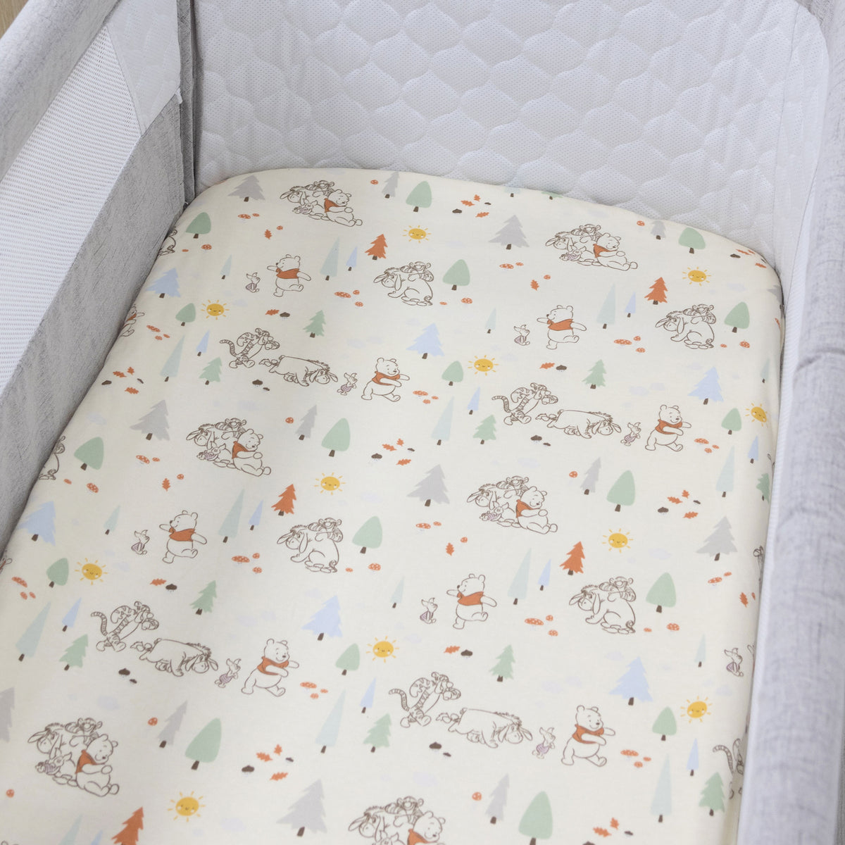 Our premium fitted sheets are so soft and gentle against baby's delicate skin. Featuring adorable Winnie the Pooh and his friends back in 100 Acre Wood, happily walking through the leafy outdoors, discovering what grows around them. Prints and patterns depict the characters at one with nature, discovering all of the beautiful forest foliage.