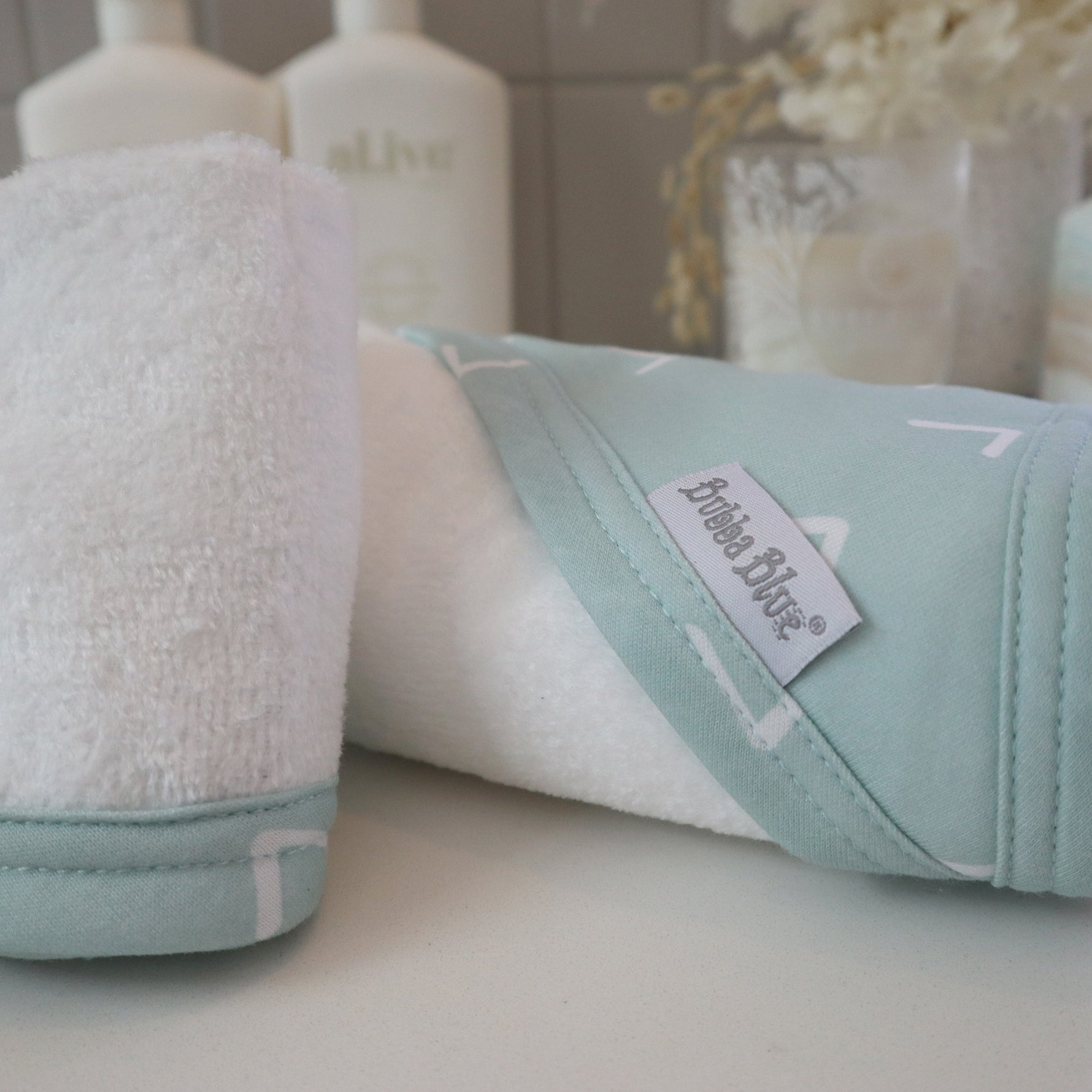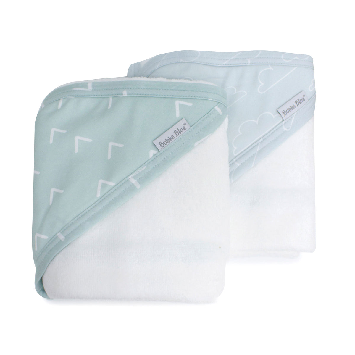 Pack includes one dusty blue cloud design hooded towel and one mint nordic mountain design hooded towel.