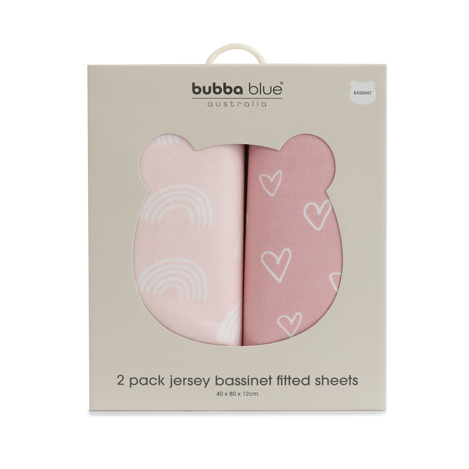 Pack includes one dusty rose rainbow design and one dusty berry heart design bassinet fitted sheet.