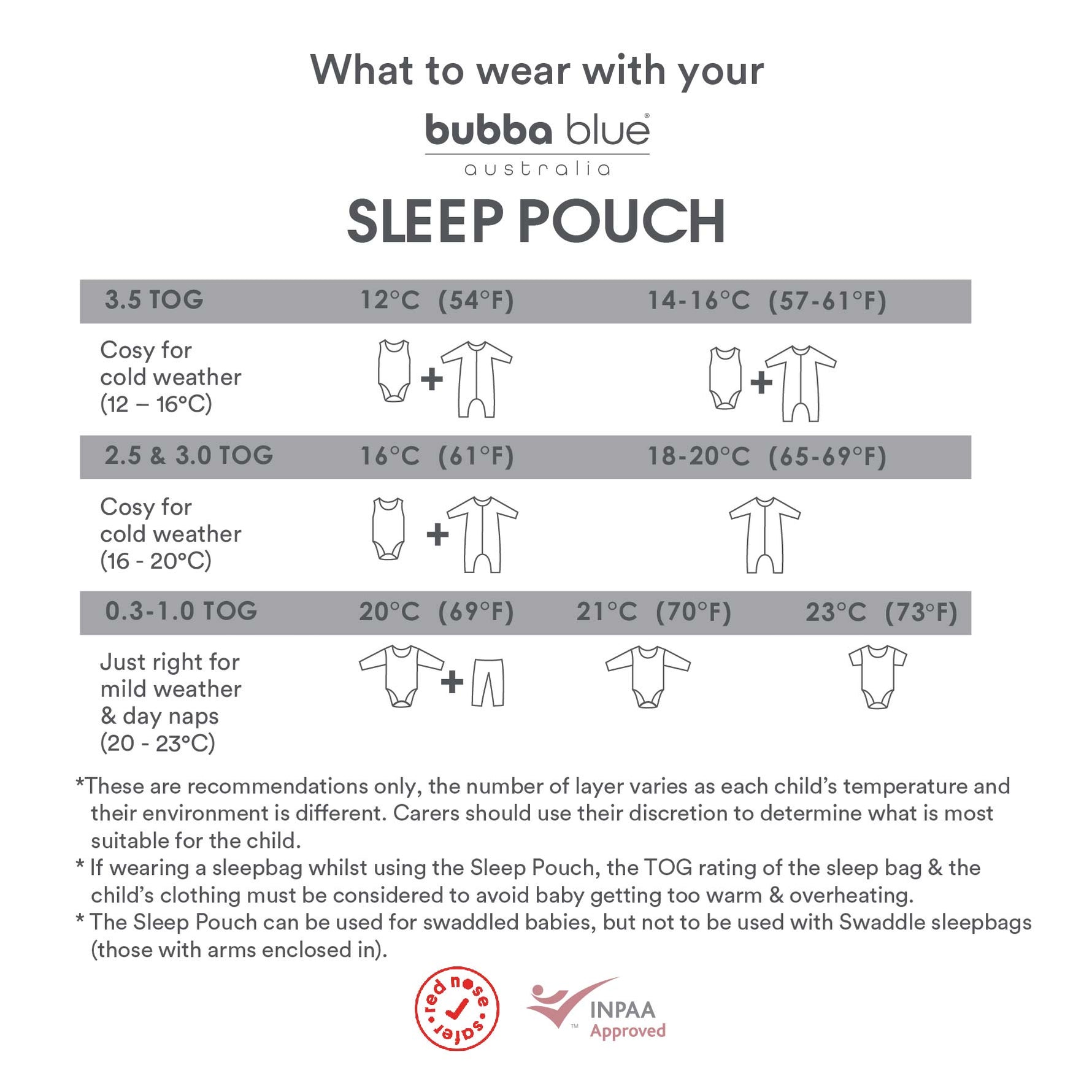 • The Bubba Blue Sleep Pouch® features the AIR™+ Air Flow Panel, on the top edge of the Sleep Pouch that lies across baby's chest. Made from cotton organic mesh & 3D spacer mesh for optimal air circulation for safety and comfort.
