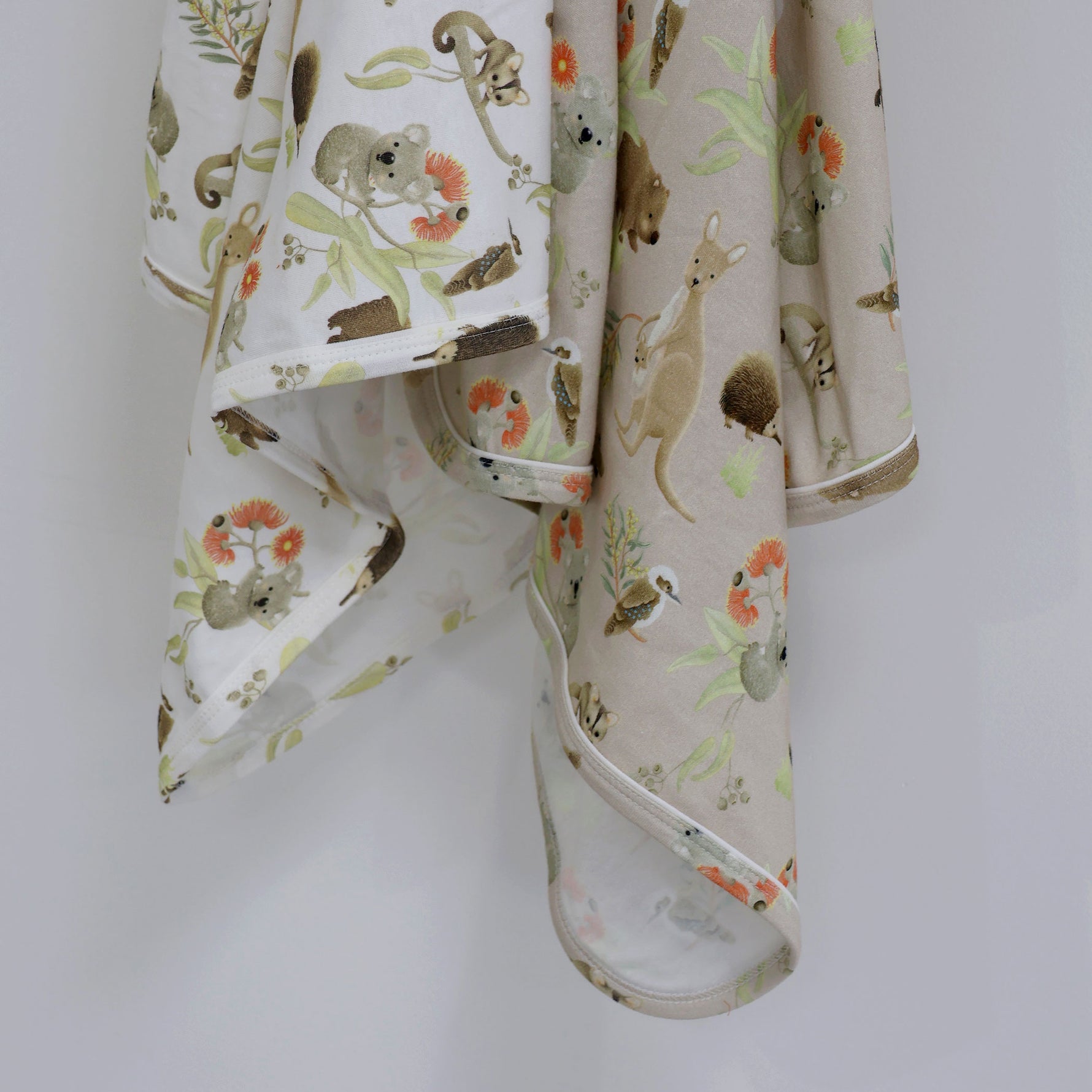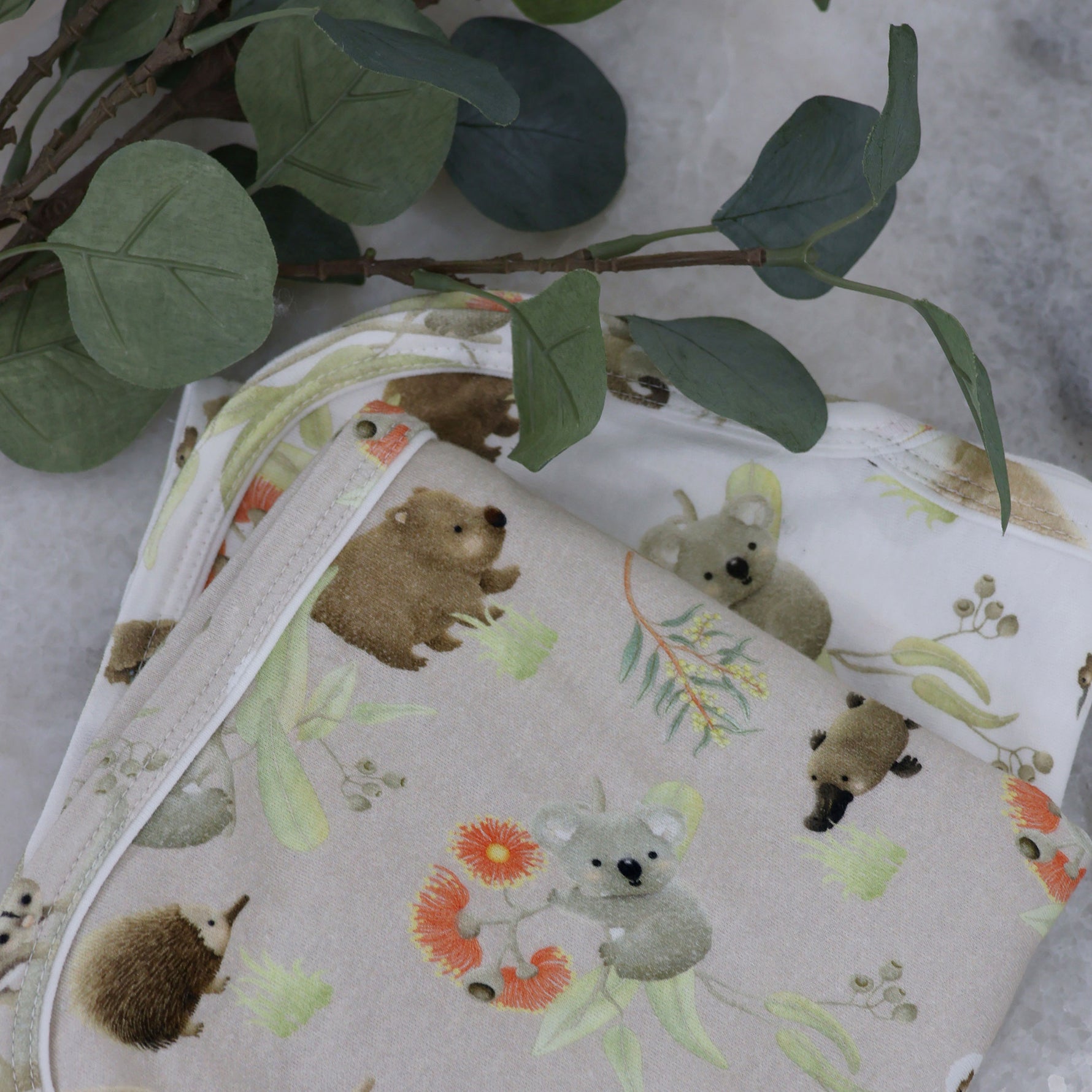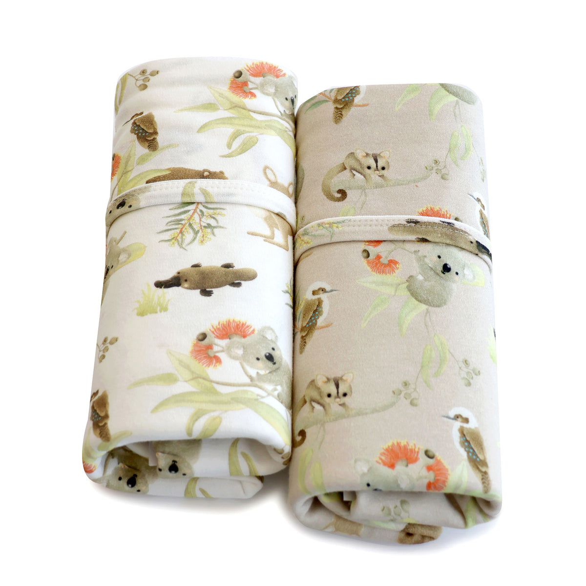 Pack of 2 jersey wraps from the Aussie Animals collection includes two stylish wraps with an over print of your favourite Australian animals.